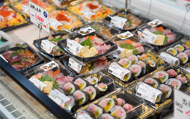 鮮魚部門では、日本一市場である豊洲市場を中心に仕入れをしております。それ以外にも産地直送の朝獲れ鮮魚も曜日限定で販売しており「鮮度=美味しさ」がお伝えできるお魚も販売しております。また、ご家庭で簡単に食べれるよう、自社にて漬け魚を化学調味料保存料を使用せず製造しております。